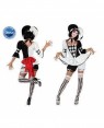 Questo travestimento da giullare per donna comprende una maglia, una culotte a sbuffo, un copricapo e un collarino (calze e scarpe non incluse), il tutto nei colori bianco e nero.La maglia reca un volant bianco bordato di nero nella parte inferiore e, per un inaspettato tocco di colore, un fiocchetto rosso sul retro. La culotte presenta dei delicati e maliziosi fiocchetti ed è elasticizzata in vita per garantirvi il massimo del comfort.Il cappello è davvero molto bello, con la sua tipica forma da giullare. Esso, cosi come il collarino, reca piccoli sonagli alle estremità.Questo costume da buffone di corte è davvero molto bello e vi farà fare un figurone in occasione del prossimo Carnevale!