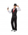 Travestimento gangster uomo composto da pantaloni, t-shirt e cravatta (cappello, pistola e scarpe non inclusi). Pantaloni a righe bianche e nere ed elastici in vita. La parte superiore abbinata riproduce una camicia bianca con gilet senza maniche. La cravatta rossa si allaccia intorno al collo con il velcro. Completo perfetto per serata in maschera o a tema.